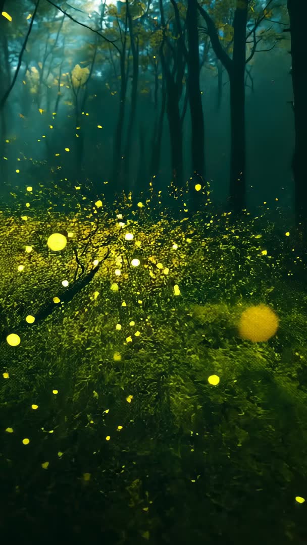 AI Generated Image. Showing vertical cinematic clip of bioluminescent particles rising and drifting above moss floor among tall trees in misty forest. Featuring slow upward camera movement, shallow depth of field, and warm yellow-green glow with soft bokeh motes. Creating mood of mystery, wonder, and calm ideal for fantasy trailers, nature sequences, meditation content, and atmospheric branding. Recommending use as mobile wallpaper, social vertical ad, Instagram Reels or TikTok background, title sequence, calming loop for wellness apps, or VJ visual for live events. Suggesting color grade boost on greens and yellows, adding subtle ambient sound design, and looping for seamless playback. Including notes on safe cropping for text overlays at top and bottom and using blending modes for composite and motion graphics work.