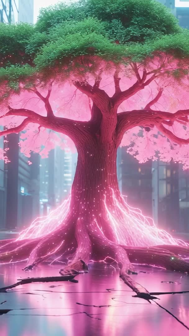 AI Generated Image. Video showing bioluminescent tree pulsing hot-pink energy through massive roots into wet, reflective neon street, canopy blossoming with soft green and pink light and drifting motes. Urban skyline in background creating contrast between organic life and futuristic architecture. Footage working well in vertical mobile formats and cinematic displays, offering strong center subject and natural vertical composition. Use cases include intro clip for sci-fi film or game trailer, background for music video or electronic album visualizer, hero visual for tech or sustainability campaign, social media reel, app splash screen, or AR/VR environment demo. Styling tips include pairing with ambient synth or atmospheric pads, adding slow-motion reveals and particle blurs, and applying high-contrast neon grading and lens bloom to heighten glow. Color palette and motion suiting branding around innovation, urban nature, energy, and wonder.