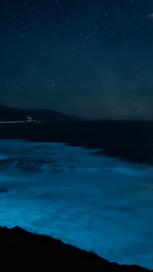 AI Generated Video. Showing bioluminescent waves glowing along rugged coastline under starry night. Bright blue surf shifting while waves moving toward shore, stirring microscopic plankton and creating ethereal glow. Distant cliff lights adding scale and depth while sky sprinkled with stars enhancing tranquil nocturnal mood. Vertical video format optimized for mobile and social platforms, capturing slow rhythmic wave motion and luminous water surface. Usage ideas: - Using for social media reels, Instagram stories, TikTok backgrounds showcasing natural wonder - Adding to relaxation, meditation, or sleep apps as calming moving background - Incorporating into travel and tourism promos for coastal destinations and night tours - Enhancing environmental and science content about marine bioluminescence and ocean ecology - Employing as hero footage for websites, digital ads, or immersive presentations focused on nature or adventure