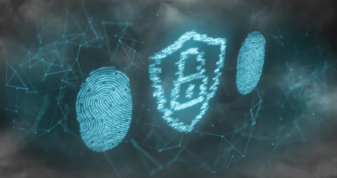 Visual representation features digital fingerprints and a security padlock icon in a networked technology background. Suitable for use in materials discussing cybersecurity, digital identity verification, data protection measures, and business technology solutions.