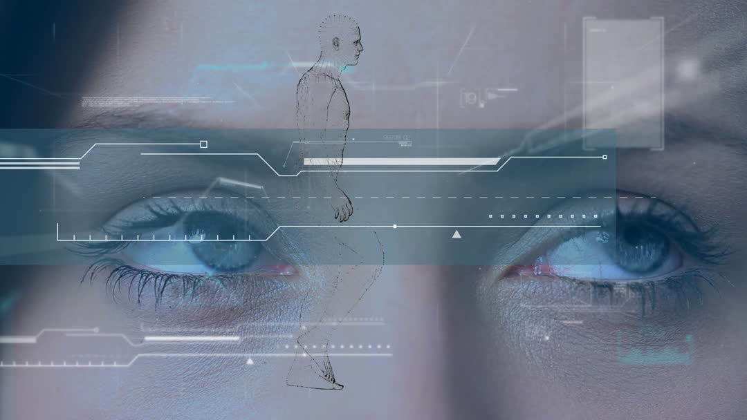 Close-up view of eyes with biometric and digital interface layered over. Displays a model of a walking human and technological data. Ideal for use in presentations or articles about biometric security, cybersecurity advancements, identity recognition technology, or digital transformation in tech industries. Exhibits futuristic themes and technological innovation.