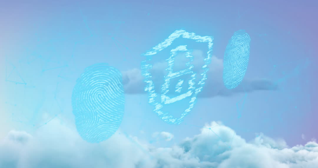 Skylight animation features various biometric security elements including a fingerprint scanner and security padlock amidst clouds, showcasing advanced cybersecurity measures integrating biometrics with cloud computing. This is ideal for highlighting modern cybersecurity solutions, as well as depicting innovative approaches in data protection and secure authentication across digital platforms for tech-related content, presentations, or educational material.