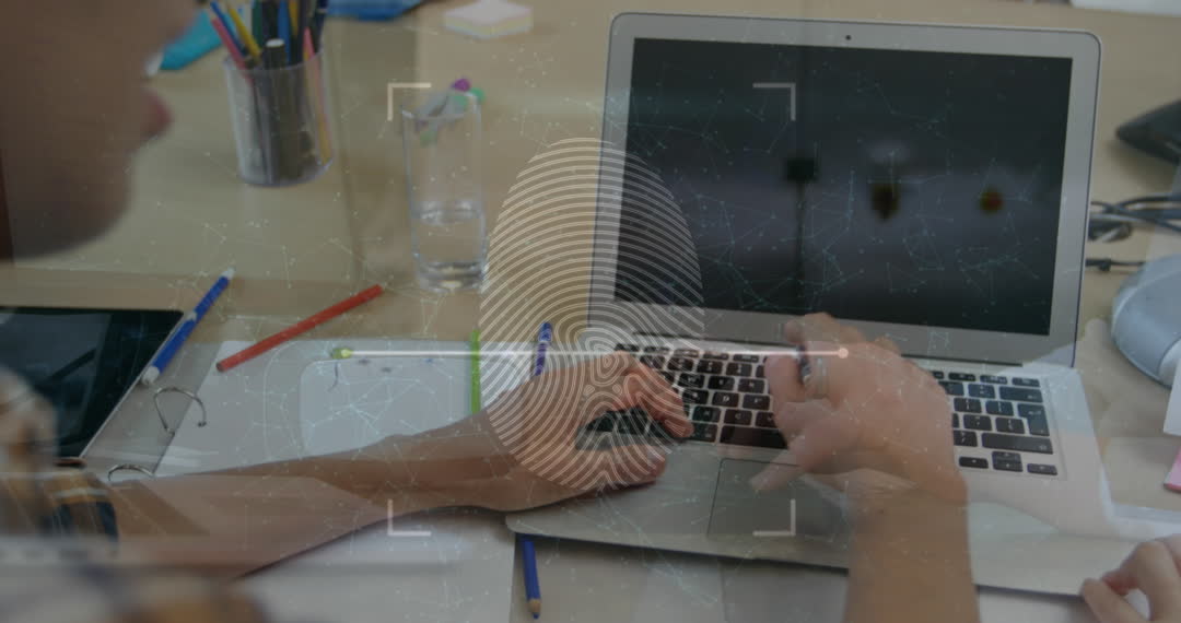 This video illustrates biometric technology with a digital fingerprint overlay on a laptop. Perfect for depicting cybersecurity concepts, digital protection themes, and advanced technology in office work environments. Useful for online articles, technology blogs, or corporate security presentations.
