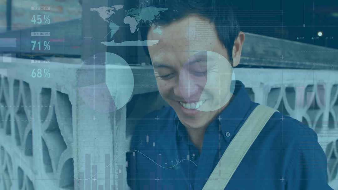 A biracial businessman is smiling while interacting with futuristic digital financial data overlays. This innovative video highlights technology integration in modern business practices. It is perfect for use in articles about global finance, technology advancements, digital transformation in the corporate sector, or marketing for finance-related apps.