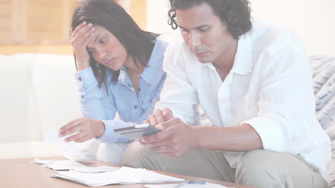 A biracial couple sits on a couch focusing on budgeting and managing their home finances. The woman looks pensive with a stack of bills, while the man uses a calculator. This scene is ideal for articles on family financial planning, stress in financial management, or home budget tips.