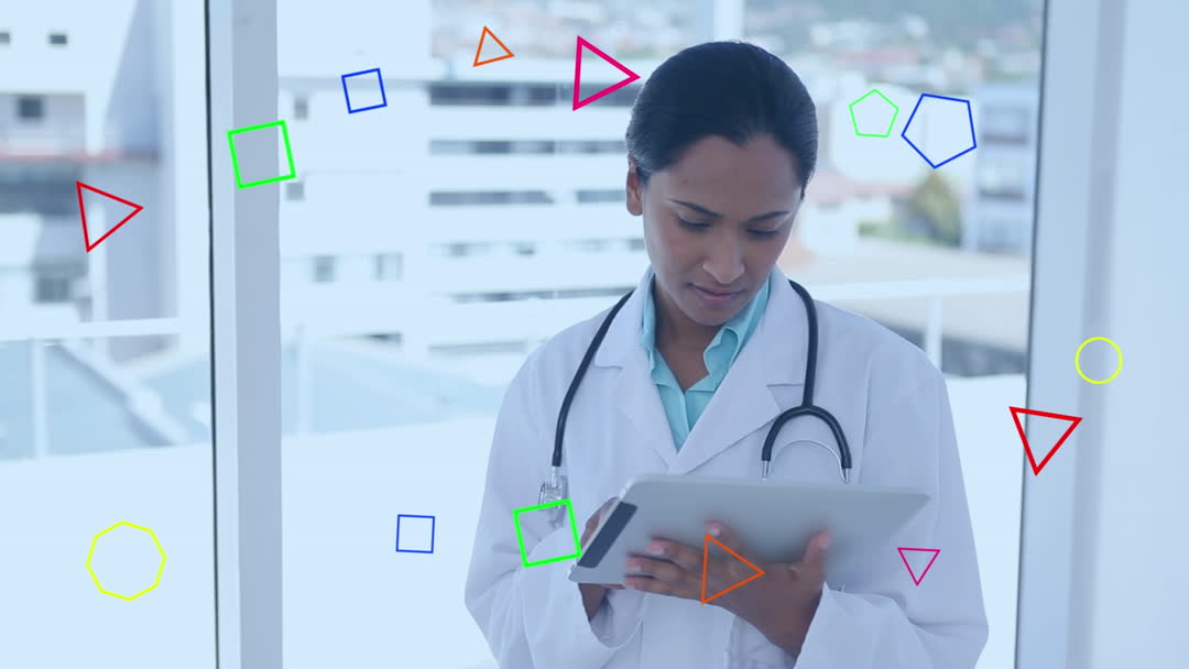 This depicts a biracial female doctor engaging with a tablet, enhancing modern healthcare with technology. The animation of colorful geometric patterns adds a dynamic and modern flair. Suitable for illustrating the integration of technology in healthcare, modern medical practices, and digital innovation.