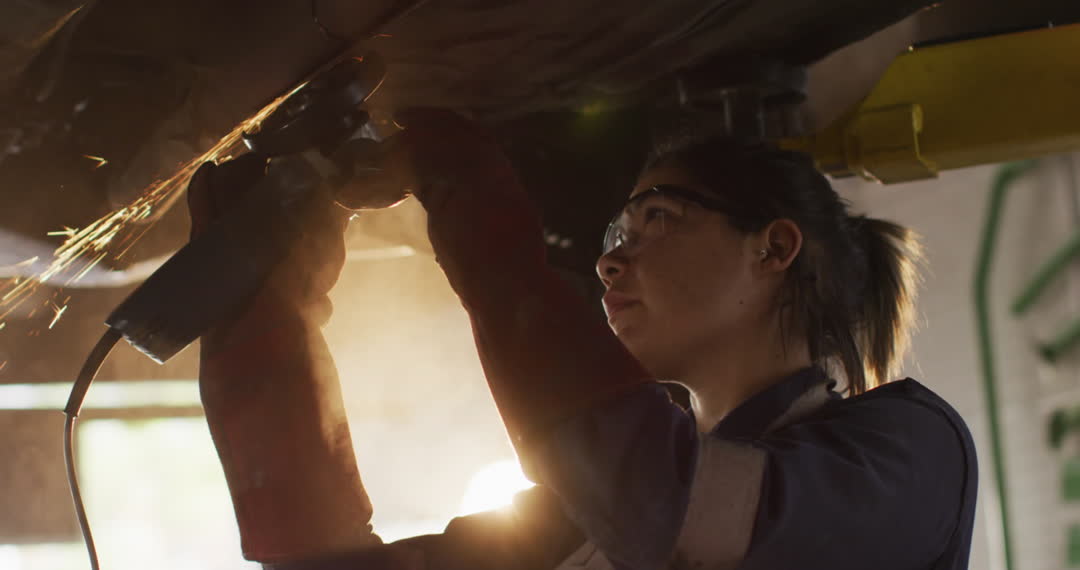 Biracial female mechanic is using a handheld grinder on a car part, creating visible sparks. Emphasis on craftsmanship and dedication shines through with her focus. Her appearance symbolizes diversity in the automotive repair industry. Picture is ideal for illustrating themes of skilled labor, gender diversity in traditionally male-dominated fields, and empowering women in small businesses. Useful for articles and promotions involving car repair services, entrepreneurship, and mechanical trades education.