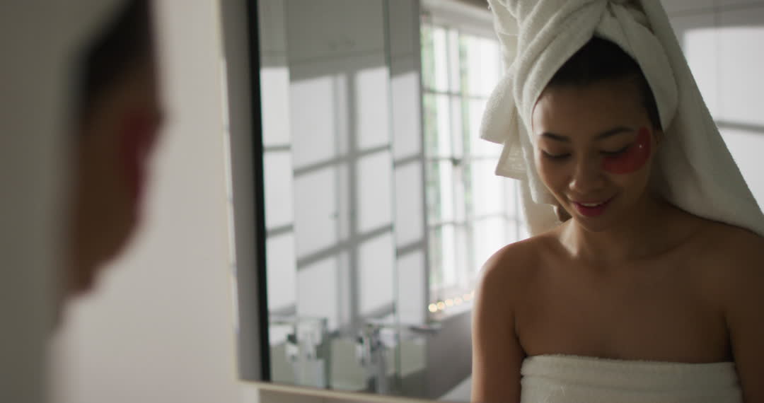 This captures a biracial woman enjoying her beauty routine with a towel wrapped around her hair and under eye patches applied. Her smiling visage reflects self-care moments that can be used for fitness and lifestyle promotions, wellness blogs, or beauty product advertisements targeting a domestic audience. Emphasizing personal time and natural beauty, it's ideal for illustrating home spa experiences or self-care routines.