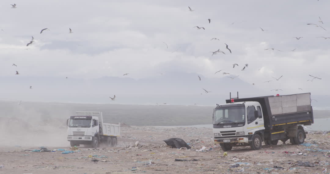 This video shows birds flying over two trucks actively working amidst a landfill. The scene depicts a busy, polluted environment under a cloudy sky, illustrating various aspects of waste management and environmental impact. This visual could be used in articles or presentations focusing on environmental issues, sustainability efforts, pollution, or involved tasks in waste disposal practices.