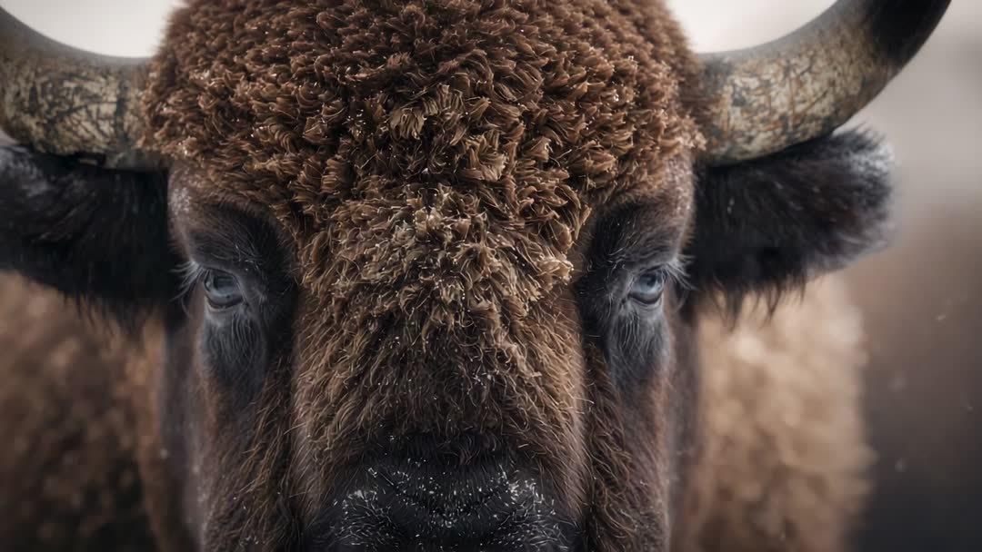 AI Generated Image. Close-up video clip showing adult American bison pushing camera while blinking and shifting gaze on snowy plain. Tight framing highlighting horns, moist nose, dense curly winter fur, and snowflakes clinging to coat. Slow push-in movement creating intimate, cinematic feel and strong texture detail, ideal for wildlife documentary, conservation campaign, or social media short. Useful for title sequences, website hero banners, editorial segments about prairie ecosystems, museum exhibit loops, or educational material on bison behavior and habitat. Color grading suggestion: warm contrast to emphasize brown fur against cool winter background. Technical tips: deliver as 4K or UHD clip, trim for 5 to 12 seconds for dramatic impact, consider looping for background or slow-motion cut for emphasis. Licensing note: suited for broadcast, online, or commercial storytelling where emotive animal portrait is required.