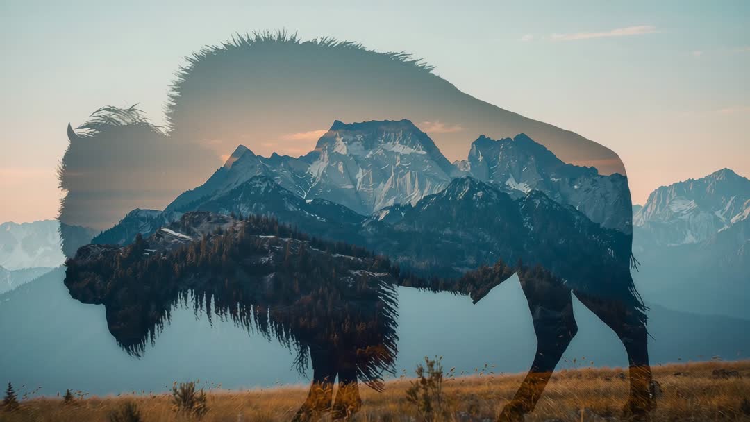 AI Generated Image. Cinematic video clip showing bison silhouette gliding across prairie with mountain range emerging inside form through layered double exposure at golden hour. Warm golden tones and cool blue mountain hues creating peaceful, majestic mood. Slow cinematic movement and soft edges producing meditative pace, suiting background use for nature documentary openings, conservation campaigns, tourism promos, and social media hero banners. Clean composition allowing title overlay, lower thirds, and logo placement; compatible with color grading and slow pans for dynamic edit. Great for print use on posters and gallery prints, or digital use as website header, meditation app background, and themed video loop.