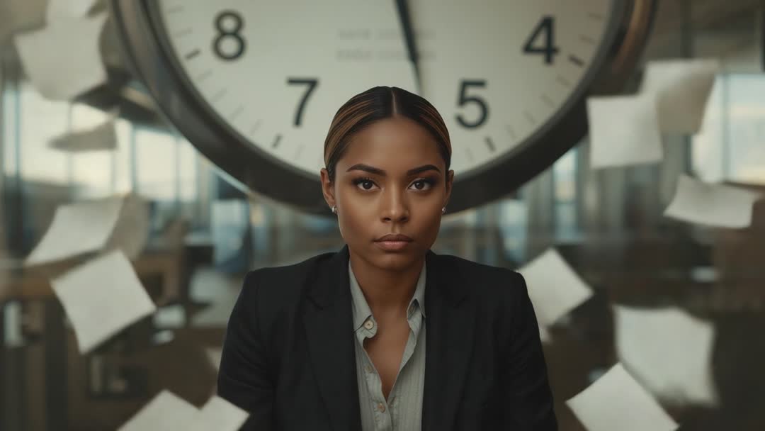 AI Generated Image. Footage showing Black woman executive holding steady gaze while clock ticking down and papers floating around desk. Cinematic tone suggesting deadline pressure, focus, leadership under stress, and time management urgency. Useful for corporate presentations, training videos, marketing campaigns, websites, social media ads, editorial pieces about productivity, workplace resilience, executive decision making. Pairing with bold headlines, countdown graphics, dramatic soundtrack, or slow-motion edit enhancing sense of momentum. Color grading presenting warm daylight tones and minimalist office interior supporting professional modern aesthetic.