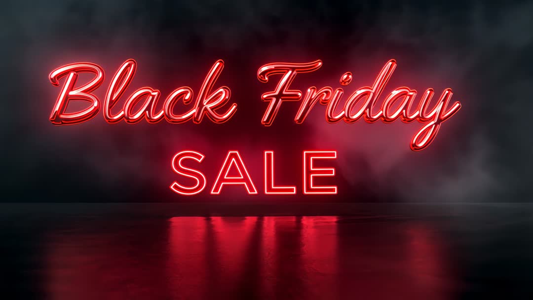 AI Generated Image. Video showing neon 'Black Friday' SALE sign pulsing crimson glow while smoke is drifting across reflective floor. Lighting is creating strong reflections and glossy texture on floor, enhancing depth and contrast. Scene is conveying urgency and high-energy retail vibe ideal for late-night promotions and doorbuster campaigns. Clip is looping smoothly for use as background element in social media ads, website hero banners, email campaign headers, in-store digital displays, TV spots, and countdown promos. Project-ready deliverables including high-resolution files, seamless loop option, RGB color grading, and optional alpha channel for compositing. Style is matching bold typography and bright discount overlays while leaving ample negative space for copy and logos. AI-generated aesthetic is providing stylized cinematic look suitable for fashion, electronics, and lifestyle brands.
