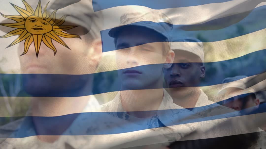 Video shows the animation of the Uruguay flag gently waving over videos of soldiers, merging national symbolism with military presence. Useful for projects highlighting international relationships, showcasing national pride, or creating engaging travel content relating to Uruguay.