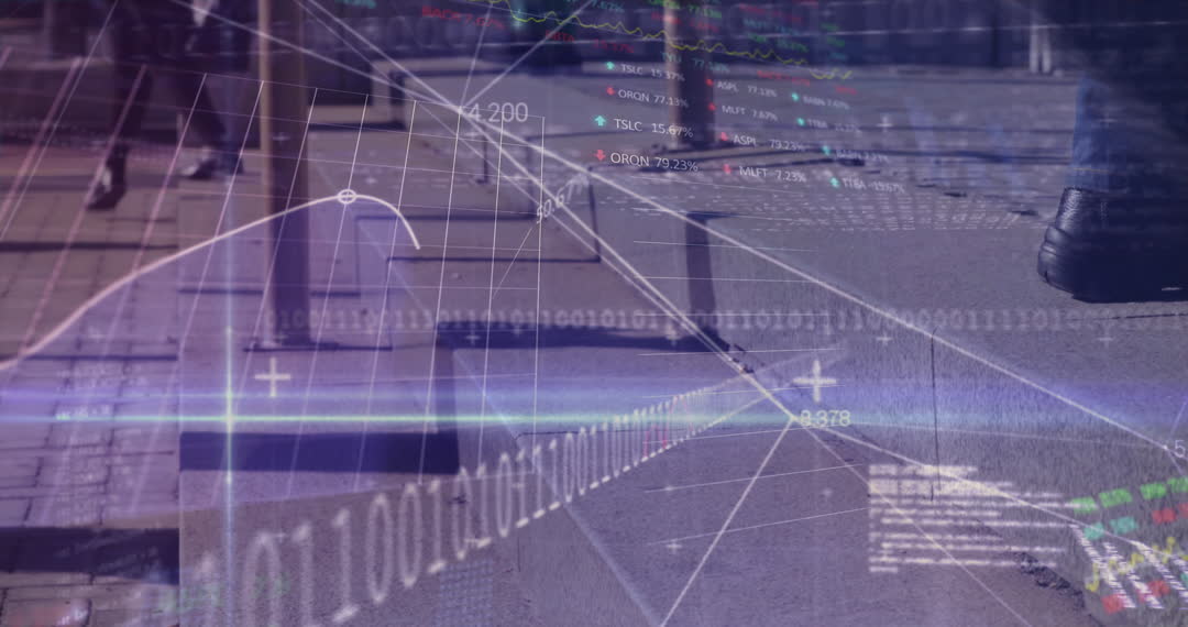 Image portrays the interaction between technology and city life through the overlay of financial data processing graphics on a busy street. This symbolizes the interconnected nature of modern society and the influence of technology in everyday actions. This can be used to illustrate concepts of digital transformation, modern global business operations, financial data analysis, or tech-driven urban environments. Ideal for articles, presentations, or campaigns focusing on technological advancements integrating with daily urban activities.