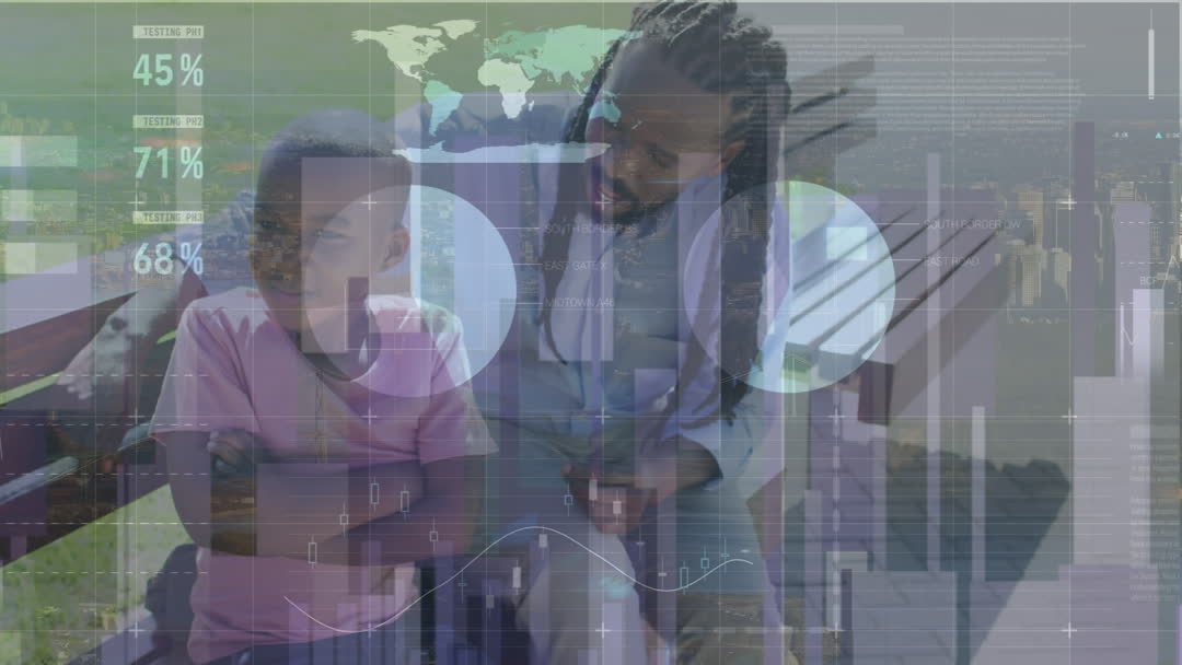Depicting fusion of technology and personal mentorship, scene presents a mentor discussing statistics with a young student alongside digital analytics overlay indicating modern teaching methods. Ideal for presentations or articles related to educational technology innovations, business coaching, or mentorship programs integrating digital tools.