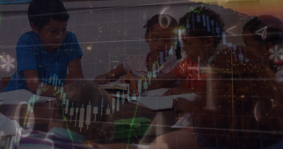 Diverse group of students studying in classroom with financial data overlay, symbolizing integration of educational activities and modern technology influences. Useful for education technology innovation resources, articles on school systems embracing financial literacy, presentations on technological impacts in education, or illustrating diverse classroom environments embracing tech education.