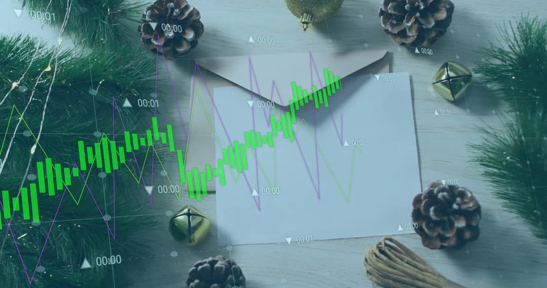 Seasonal and festive elements blend with complex financial data, showcasing volatile market analytics within holiday context. Useful for visually creative financial reports, presentations aligning economics with the holiday time profiles, or any media project illustrating the dual nature of winter festivities mixed with financial trends.
