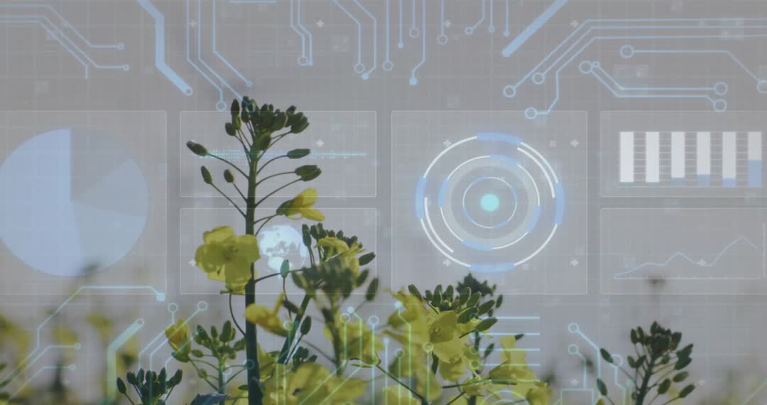 Stems with yellow flowers sway naturally as transparent overlay shows animated diagrams with data elements like charts and graphs. Conveys merging of natural environment and modern technology, useful in illustrating advancements in agricultural analytics or smart farming techniques. Ideal for content about agritech development, integrating tech into traditional farming, and the future of sustainable and data-driven crop management.
