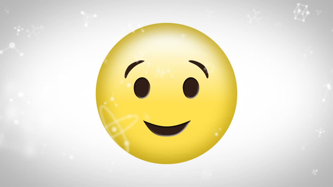 Bright yellow emoticon is set on a white background, gracefully blinking as animated molecules appear and interact with it. This composition offers a playful blend of technology and emotional expression. Ideal for use in materials focused on social media interactions, digital communications, technology ventures exploring emotional connectivity, or scientific presentations aiming to introduce playful concepts with a human touch.