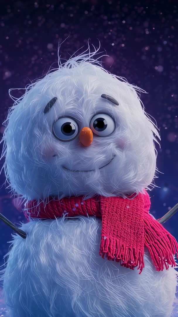 AI Generated Image. Blinking and smiling, furry snowman wearing bright red knit scarf, snowflakes drifting across starry night sky. Closeup portrait highlighting big expressive eyes, carrot nose, twig arms, textured fur and cozy scarf. Vertical 9:16 composition optimized for mobile platforms and social media. Working great for mobile holiday ads, powering social media reels, anchoring seasonal greeting animations, enhancing kids content and supporting retail digital signage. Offering loopable short clip for seamless repeat, pairing well with gentle instrumental music or warm voiceover. Suggesting overlay text in lower third, adding logo in top corner, using soft color grading to emphasize warm cozy mood. Ideal for holiday campaigns, greeting card animation, seasonal app splash screens, festive event promos and family friendly storytelling.
