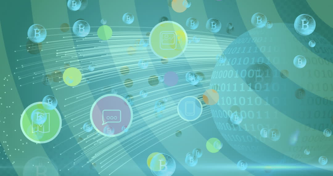 Abstract illustration of global connectivity with blockchain technology showing networks and data flow represented by bitcoin symbols, colorful graphics, and binary code. Ideal for use in articles or presentations on digital currency, blockchain innovation, financial technology solutions, or networking concepts.