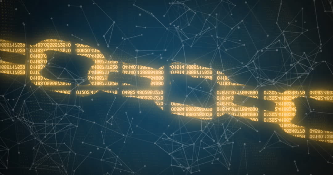 Animation showcasing a digital chain formed by binary codes against an abstract technological background. Suitable for presentations on blockchain technology, cyber security, and network protection themes. Ideal for use in articles discussing encryption and data safety in digital environments.