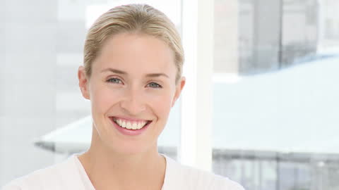 Blonde Businesswoman Smiling in Bright Office Space Video