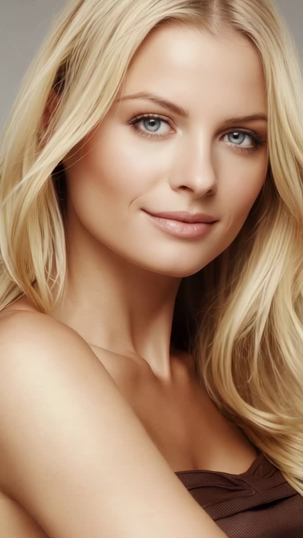 AI Generated Image. Closeup vertical video showing blonde model posing for headshot with direct confident gaze and subtle smile. Soft studio lighting highlighting smooth skin, natural makeup, flowing hair, brown strap top, shoulder-baring composition. Framing focusing on face and upper chest, shallow depth of field keeping background neutral. Useful for beauty campaigns, skincare product ads, makeup tutorials, fashion brand reels, influencer content, casting reels, social media stories, profile thumbnails. Editing suggestions: use slow push-in, gentle color grade enhancing warm skin tones, add minimal text overlay and logo reveal. Cropping recommendations: maintain 9:16 frame for reels and stories, create alternate 4:5 and 1:1 crops for feed. Licensing ideas: editorial portrait, commercial beauty, lifestyle branding.