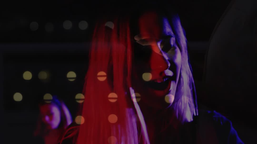 Video showing blonde vocalist tilting head and singing under red and purple gel lights while dotted bokeh overlay adds retro cinematic texture. Closeup shot capturing expressive mouth movement and partial silhouette of duet partner in background, creating intimate yet mysterious mood. Lighting contrast and motion blur creating dynamic visual rhythm suited for music-driven storytelling. Use for music video scenes, lyric video backgrounds, artist promos, album teaser clips, concert openers, fashion film sequences, social media reels, and advertising spots. Pairing with bold typographic titles, neon color grade, rhythmic cuts, and subtle grain will enhance cinematic feel. Clip working well as loopable background, intro sting, or mood-building interlude in multimedia projects.