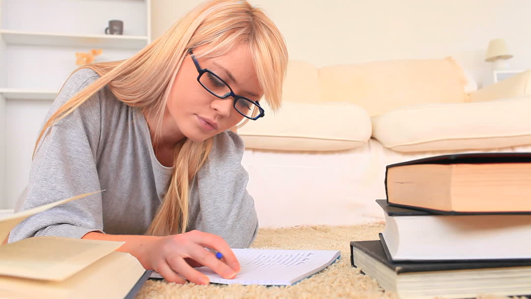 Blonde woman wearing glasses intently taking notes while lying on the floor with open books nearby in a casual, homely environment. Suitable for use in educational content, study tips articles, or advertisements for glasses, stationery, or furniture associated with comfortable learning spaces.