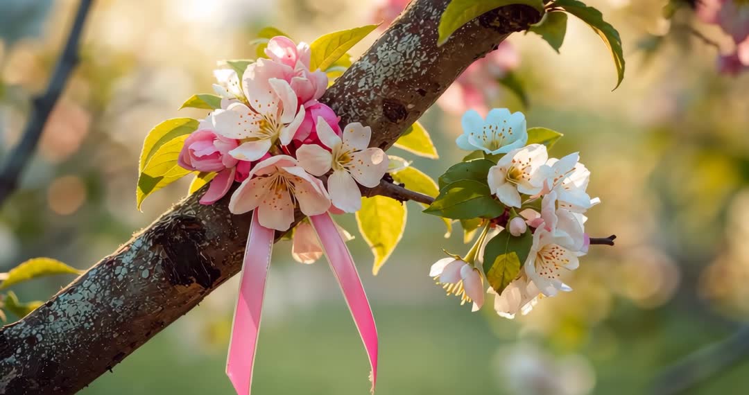 AI Generated Image. Soft breeze gently moving a tree branch covered in blooming flowers adorned with a pink ribbon, evoking a sense of tranquility and elegance outdoors. Perfect for concepts related to spring, nature's serenity, and floral beauty. Ideal for promotional content, blogs about floral arrangements, and seasonal greeting cards.