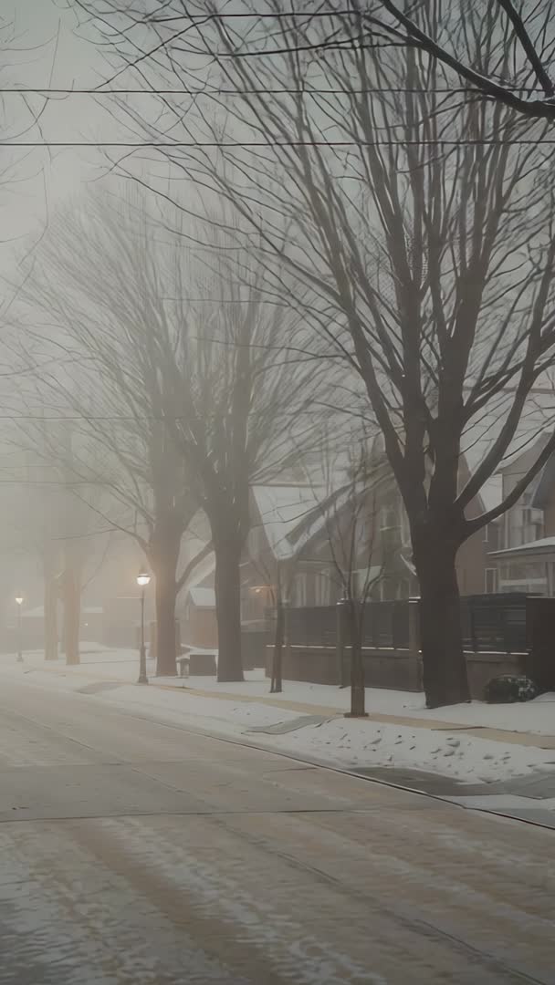 AI Generated Video. Vertical video showing blowing snow forcing bare street trees swaying through dense fog along suburban neighborhood with dim lamplight glowing. Mood conveying cold, solitude, quiet streets, winter storm drama, urban winter texture. Ideal for weather forecast footage, local news packages, seasonal social posts, cinematic openers, and atmospheric b-roll for film or commercial projects. Editing suggestions include applying slow motion loop, adding cool color grading, layering wind sound effects, and using subtle vignette for moody feel. Delivery ready in vertical 9:16 format, suitable for mobile stories, reels, IGTV, TikTok, and broadcast lower thirds.