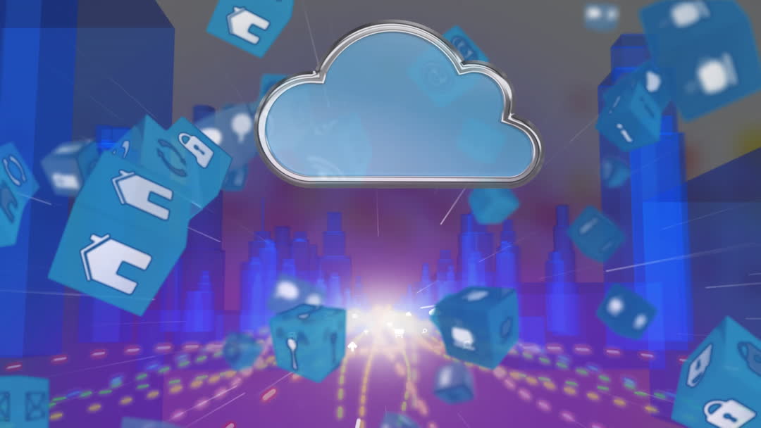 - Blue Cloud with Falling Social Media Cubes Over 3D Digital City