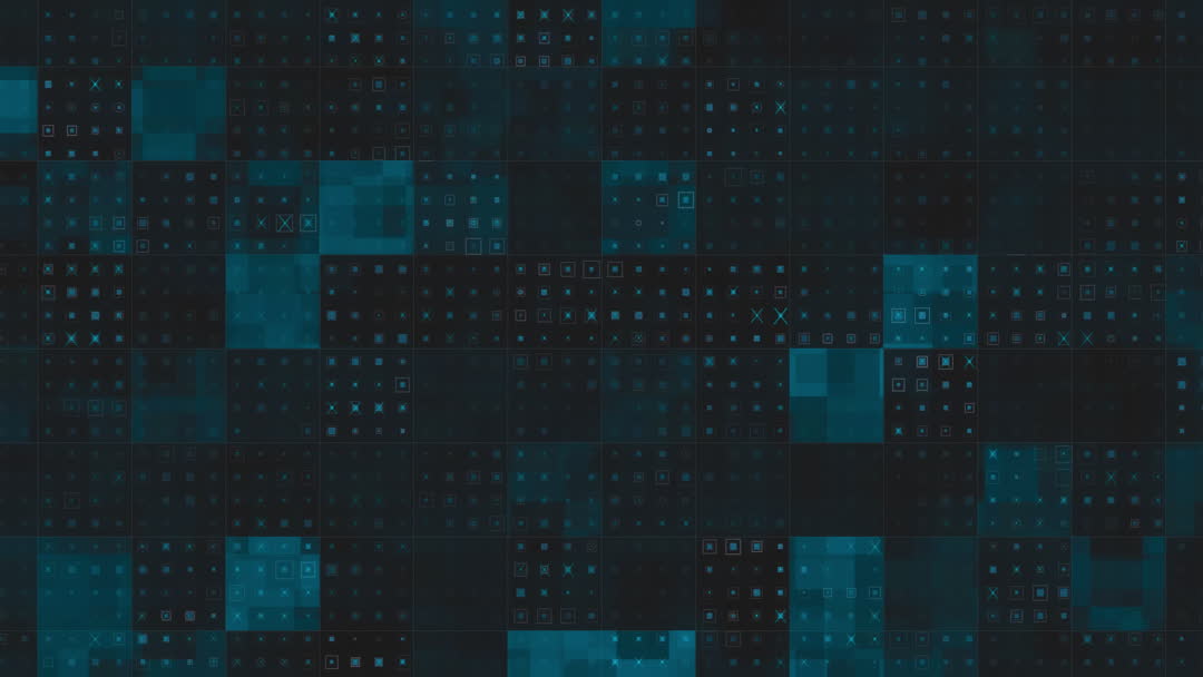 Blue glowing and flickering squares form an abstract representation of a digital network or circuit board. This intricate layered design is perfect for representing concepts related to technology, global communication, and data processing. Ideal for use in presentations, websites, or marketing materials focusing on tech innovations, cybersecurity, and computing processes.