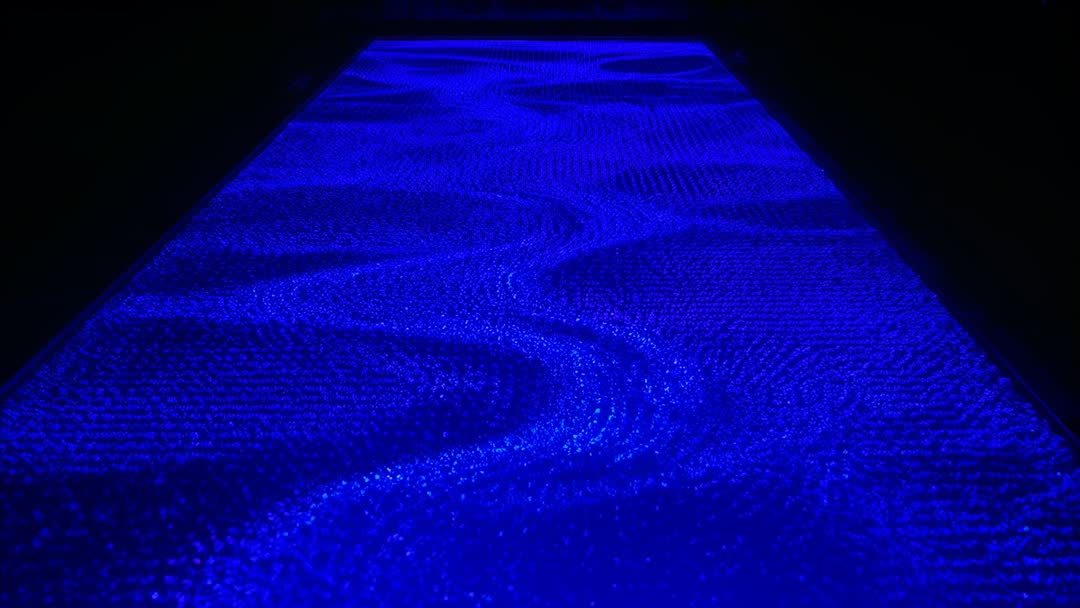 AI Generated Image. Looping video showing blue LED pixel panel rippling forward across dark gallery floor, forming flowing waves of glowing dots and grid patterns. High-contrast neon blue palette creating hypnotic motion and deep sense of depth. Low-angle perspective emphasizing scale and repeating pixel texture. Perfect for tech, music, art, event, and VR projects needing atmospheric or futuristic background. Ideal for motion graphics overlays, stage visuals, digital art exhibitions, website hero banners, album visuals, and sci-fi promotional reels. Editing suggestions: applying color grading to match brand palette, speed ramping for dramatic impact, looping for ambient displays, and cropping for social formats. Suitable for broadcast, social media, installation previews, and creative stock libraries.