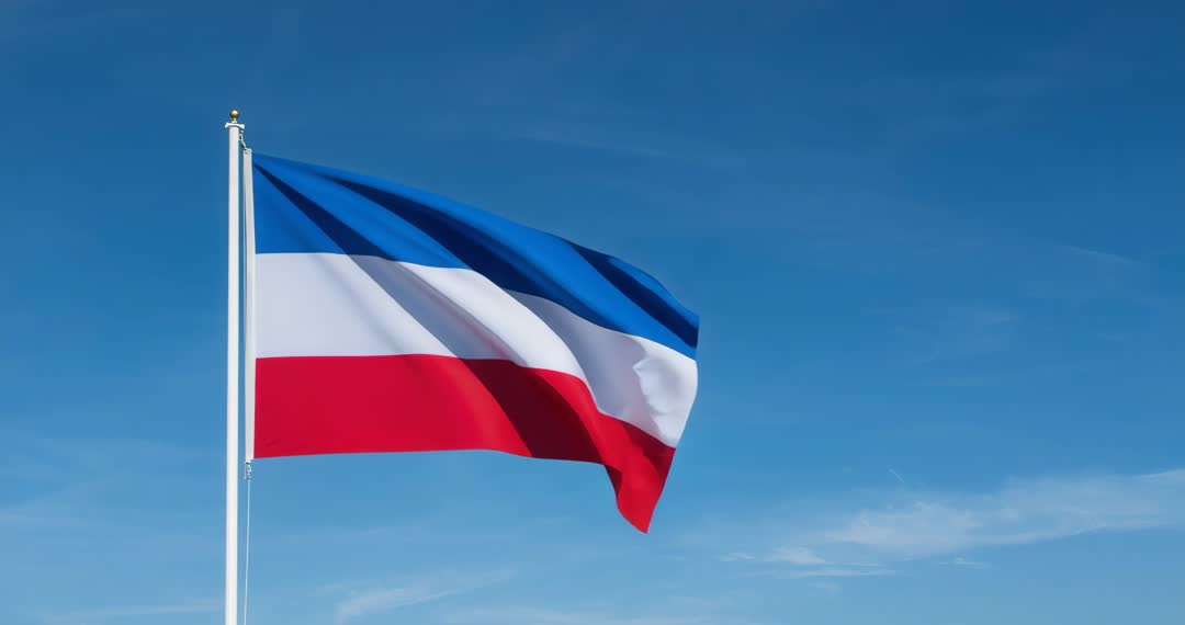 AI Generated Video. Video captures a blue, white, and red flag gently waving on a flagpole against a bright blue sky. Symbolizes patriotism and national pride. Ideal for projects focusing on national events, cultural presentations, or themes of freedom and unity. Usage includes educational content, historical documentaries, or promotional material promoting solidarity.