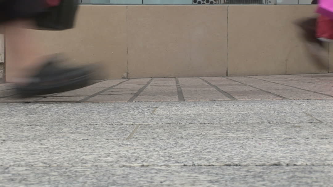 Blurry legs of pedestrians walking quickly on urban pavement, capturing dynamic city life. Great for blogs or articles focusing on city living, urban transportation, or fast-paced lifestyles.