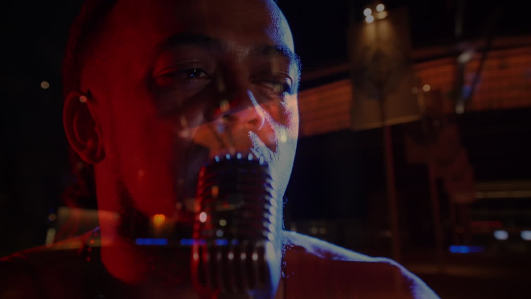 Blurred Traffic Overlaying with Male Singer at Night Video
