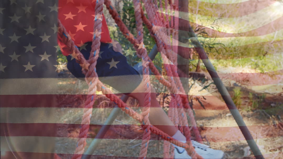 This composition featuring a blurred overlay of the American flag and a child engaging in outdoor rope climbing activity evokes a strong sense of national pride and patriotism. The video appeals to themes of individuality and adventure centered within an authentic presentation of childhood play and sports activities. Suitable for use in articles, blogs, or campaigns promoting outdoor play, national events or celebrating Independence Day.