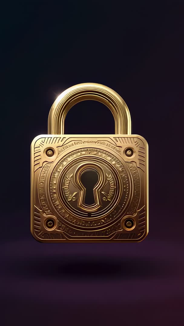AI Generated Video. This vertical 9:16 video clip showing bobbing ornate gold padlock reacting to left-side light against dark gradient backdrop. Close-up framing highlighting embossed detailing, decorative keyhole silhouette, metallic reflections, and subtle floating motion. Cinematic rim lighting creating shimmer and high-contrast highlights for premium visual impact. Loop-ready animation and clean negative space allowing overlay text or logo placement. Ideal for website hero, app intro, cybersecurity campaign, luxury brand promotion, financial services marketing, jewelry or safe product reveal, social media vertical ad, and motion graphics projects. Technical notes: vertical 9:16 aspect ratio, high-resolution render, smooth slow-motion float, easy color grading and compositing.