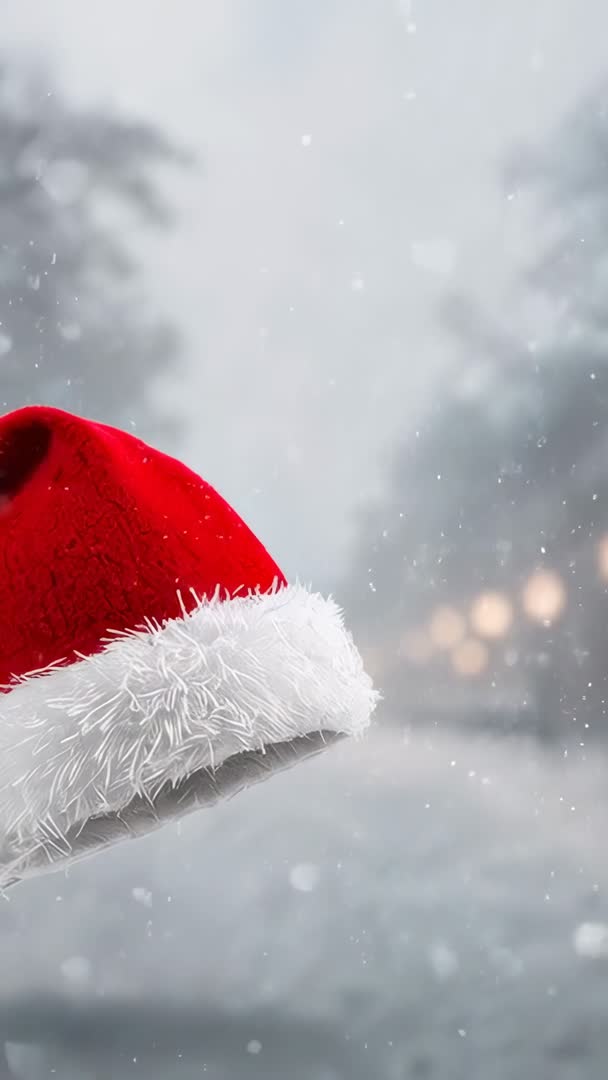 AI Generated Video. Showing bobbing red Santa hat drifting left across snowy lane, breeze nudging delicate flakes while soft bokeh lights glow in distant conifers. Featuring ample copy space on right for text, logo placement, or lower third captions. Evoking cozy, nostalgic holiday mood ideal for seasonal promotions. Suggesting use for holiday social media stories, Instagram Reels, TikTok clips, mobile wallpapers, greeting video openers, website hero banners, digital ads, in-store displays, or event invitations. Providing loopable short clip potential with gentle camera motion or slow-motion option for cinematic feel. Advising color grade for warm tones and adding subtle snowfall sound design for immersive effect.