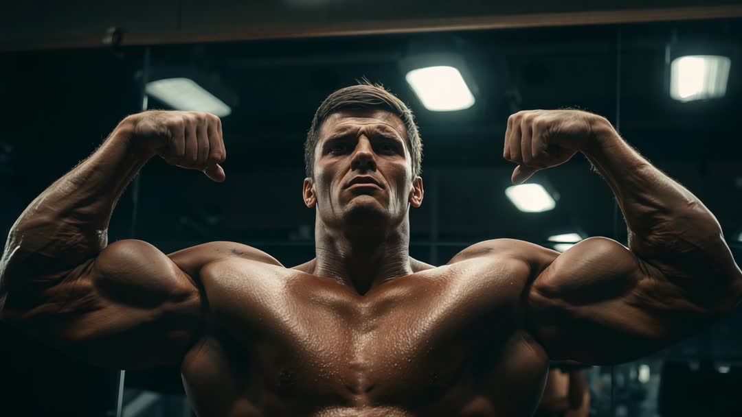 - Bodybuilder Flexing Muscle Definition at Gym Mirror