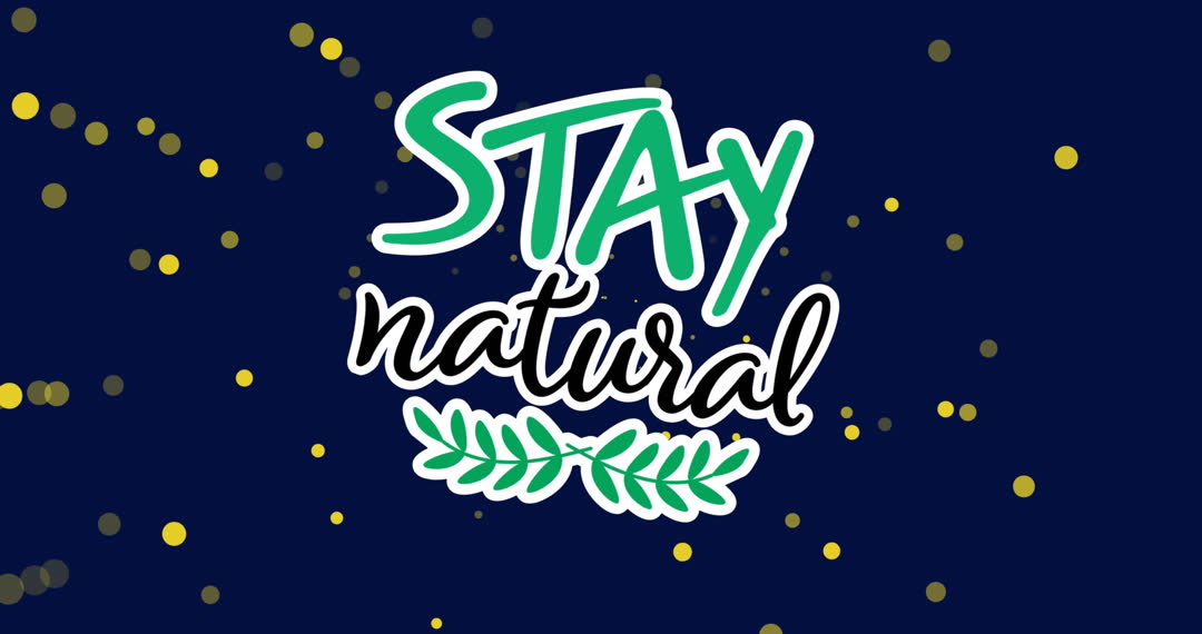 Graphic featuring 'Stay Natural' text with stylized typography and leaf decoration against a blue backdrop sprinkled with dots, suggesting stars or confetti. This captivating and simple design promotes natural lifestyles and eco-consciousness. Perfect for digital marketing materials, environmental campaigns, or social media advocating sustainability and ecological behaviors.