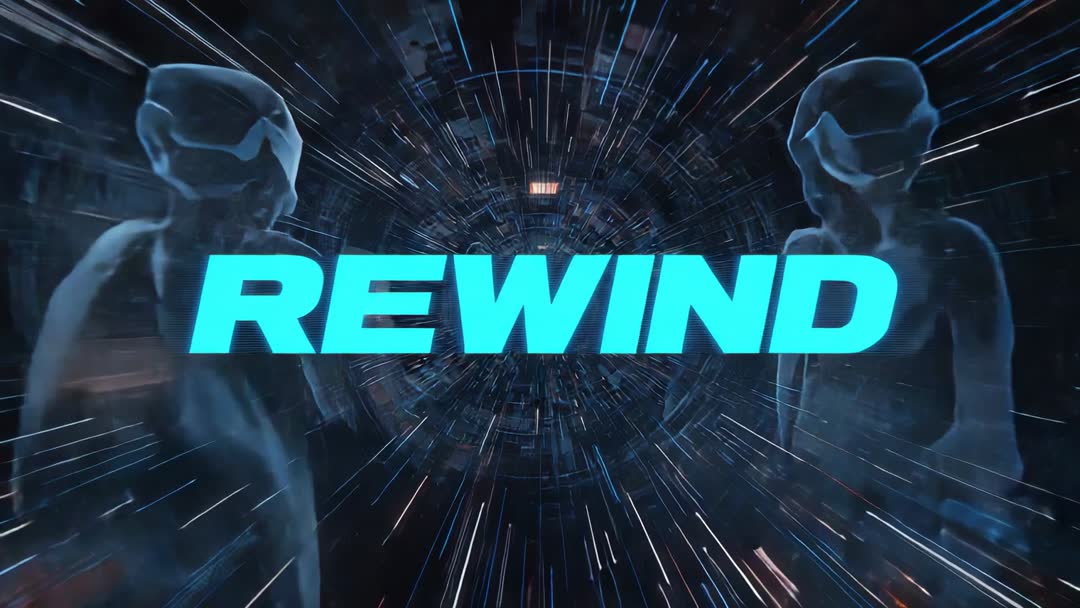 - Bold REWIND text racing through neon sci-fi tunnel with holographic silhouettes