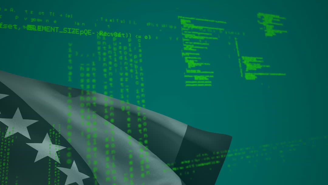 Representation of digital data processing alongside Bosnia and Herzegovina flag. Evokes ideas of technological advancement, global business, and patriotism. Useful for themes involving national tech growth, data analysis, or international business relations within Bosnia and Herzegovina.