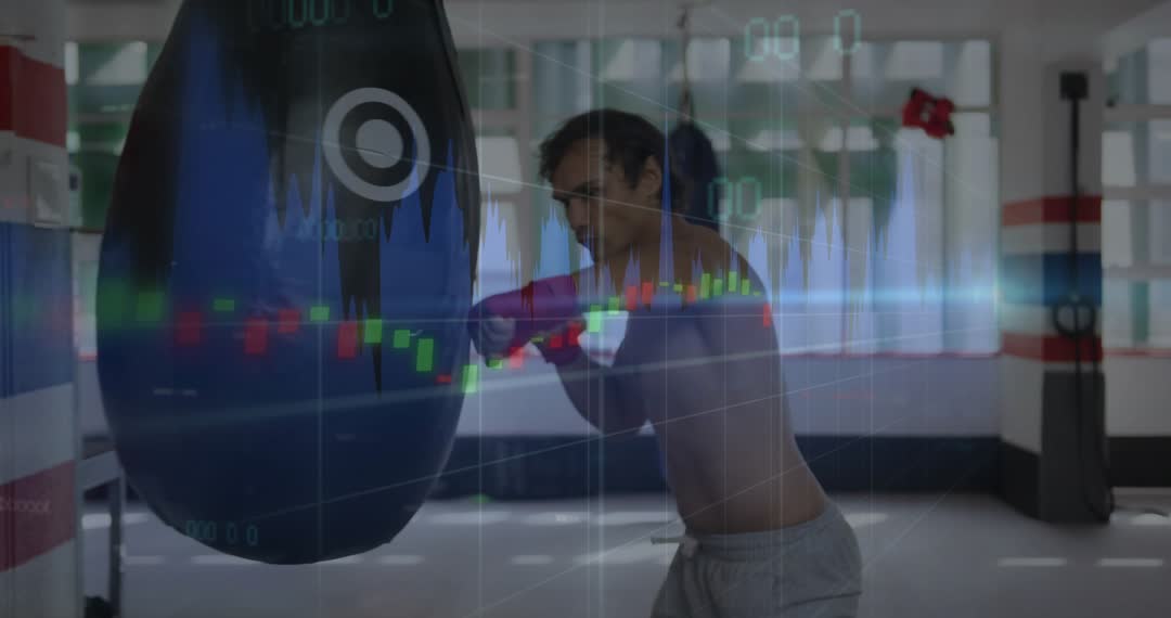 - Boxer Training on Heavy Bag with Candlestick Chart Overlay for Sports Performance Video