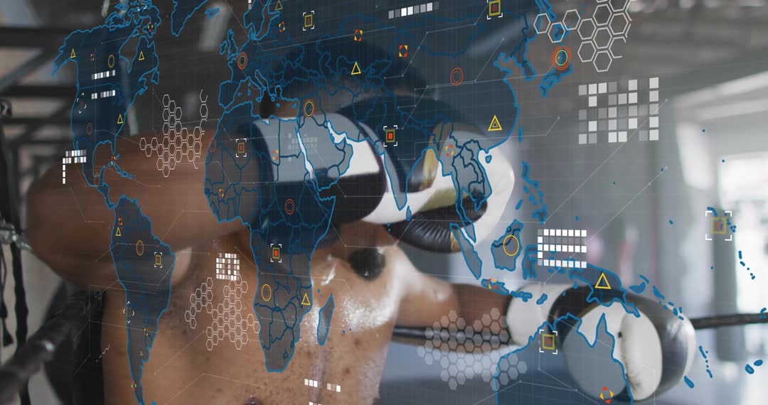 Dynamic sports video combining athleticism with cutting-edge technology. Perfect for articles or campaigns focused on merging sports with tech, innovation in fitness, or the global impact of trends in athletics. Background of a boxer illustrates dedication and strength, overlaid with transparent digital network map, emphasizing advancement tiers. Ideal for use by tech companies or health and fitness industries promoting future-ready solutions.