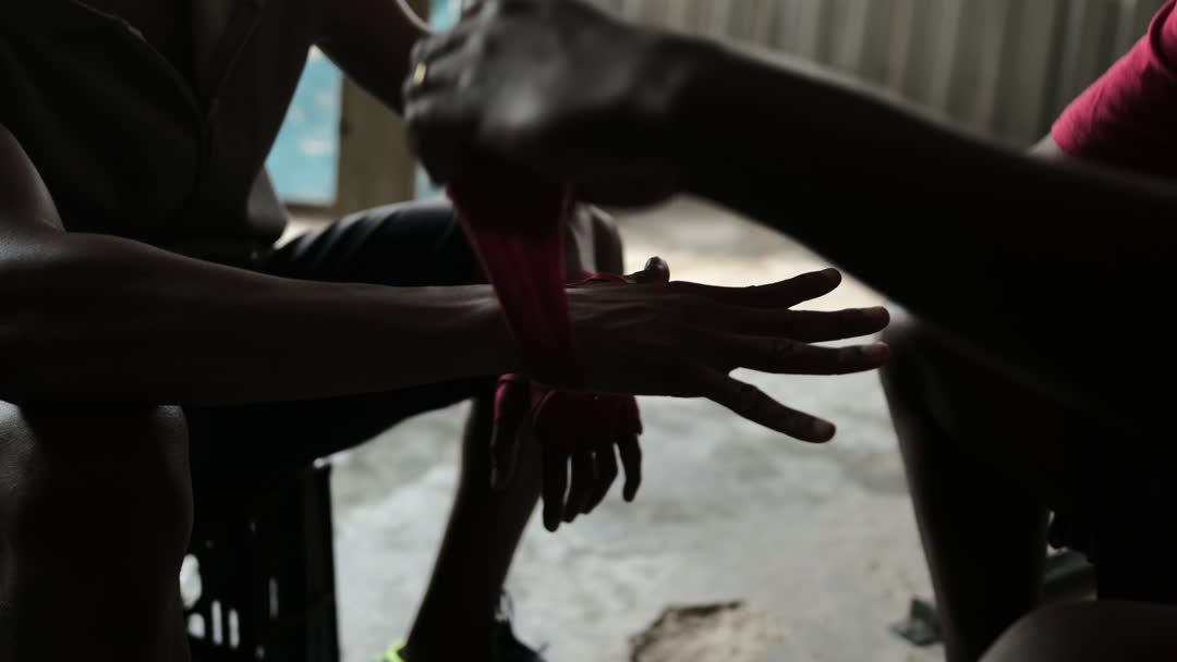 Depicts a boxer having hands wrapped with wrist wraps in a dimly lit gym, highlighting the preparation before training or a match. The video can be used for articles or advertisements related to boxing, fitness routines, athletic preparation, or sportswear promotion. It conveys a sense of routine, determination, and focus common among athletes.