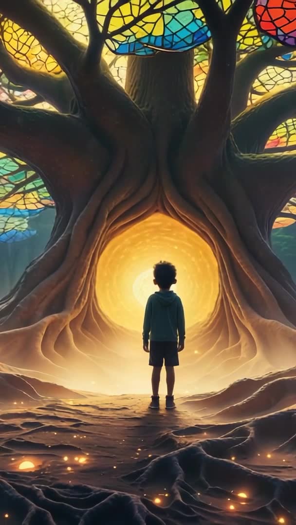 AI Generated Image. Vertical fantasy video showing silhouette of young boy approaching glowing portal nestled within ancient tree trunk. Scene featuring warm golden core light radiating through root arches and stained-glass like canopy, creating strong contrast and immersive depth. Visual mood evoking wonder, curiosity, and magical discovery, inviting viewer exploration. Footage working well for book trailers, film openers, social media vertical reels, mobile app intros, children's story content, fantasy game trailers, and inspirational brand spots. Creative suggestions including using slow dolly-in or subtle parallax, layering ambient pad music with gentle chimes, adding soft particle effects for magic dust, and applying voiceover narration for storytelling. Color palette blending warm gold center with cool blue-green canopy offering clear space for titles and overlays. Targeting families, educators, storytellers, indie filmmakers, game developers, and creative agencies seeking whimsical, mysterious, or inspirational visuals.